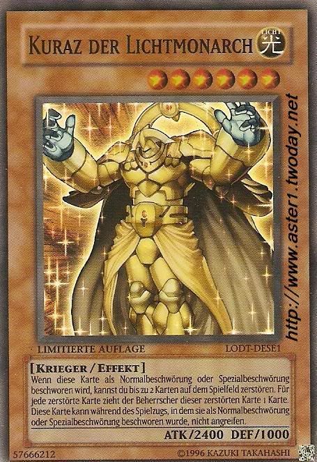 Wenn diese Karte als Normalbeschwörung oder Spezialbeschworen wird,kannst du bis zu 2 Karten auf dem Spielfeld zerstören.Für jede zerstörte Karte zieht der Beherrscher dieser zerstörten Karte 1 Karte.Diese Karte kann während des Spielzugs,in dem sie als Normalbeschwörung oder Spezialbeschwörung beschworen wurde,nicht angreifen.